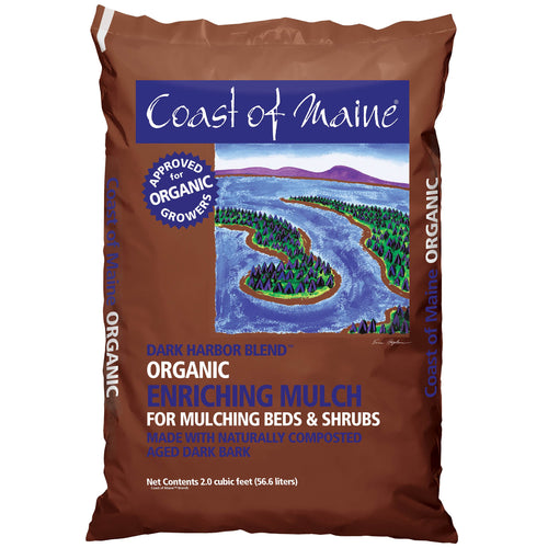 Coast of Maine Organic Products Dark Harbor Blend Enriching Mulch is an exceptionally rich, naturally dark, fine textured blend of self-composted barks. It helps retain moisture and insulate the surface soil against temperature variations that can harm roots. Because it is composted, it will not rob the soil of nitrogen and can be dug into the beds in the fall to improve the organic content of the soil.