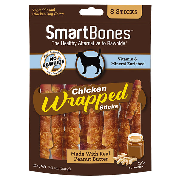 SmartBones® Chicken Wrapped Sticks with Peanut Butter Have All the Benefits of a Rawhide Chew – WITHOUT the RAWHIDE! NO RAWHIDE SmartBones® Chicken Wrapped chews are made with REAL CHICKEN and wholesome VEGETABLES, and have a delectable chicken layer wrapped around the outside, for a scrumptious taste dogs can’t resist.